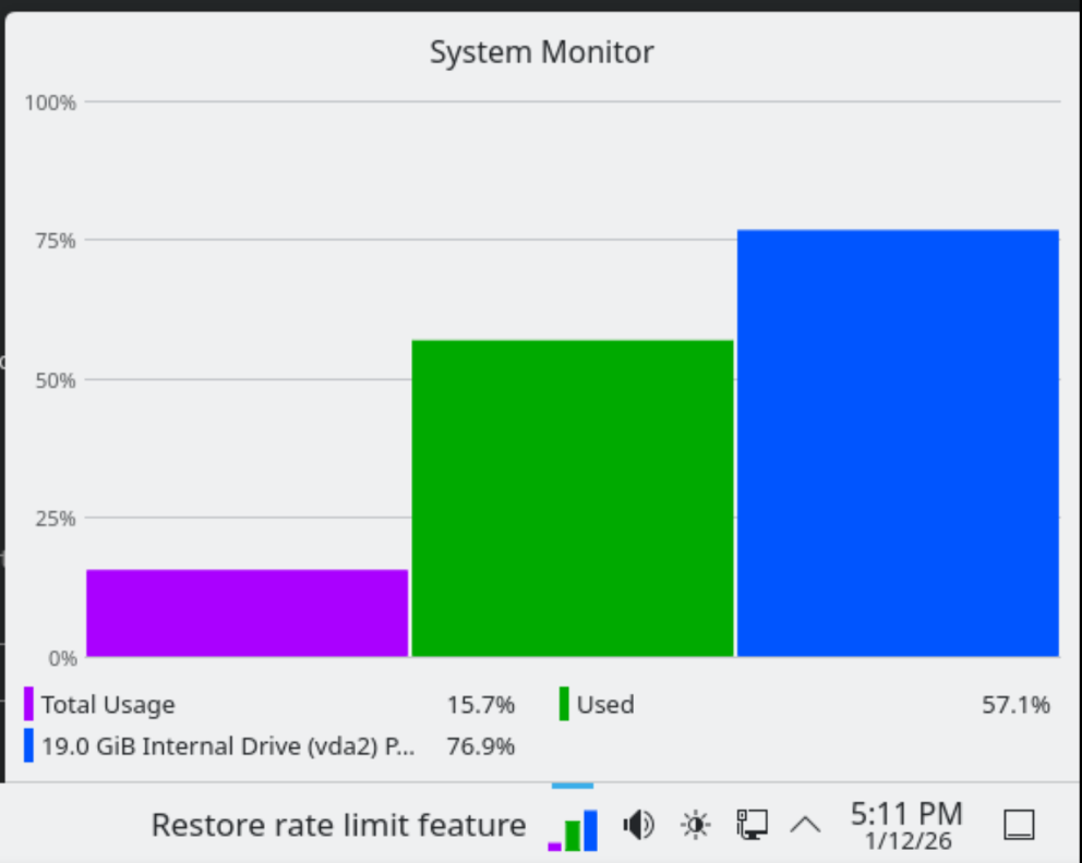 Another thing I love about KDE is the System Monitor Sensor widget. It’s configured to show RAM, CPU, and disk space all in one chart, so you can see when a VM (or the host) is suffering.